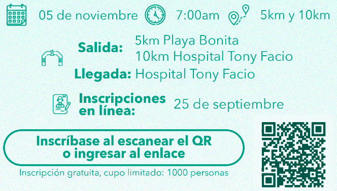 Este evento es abierto a todo público y este año se realizará el 5 de noviembre a partir de las 7 a.m. La carrera tiene una capacidad de 1000 inscripciones y se realizará en Limón, con el objetivo de reforzar su estrategia regional y darles oportunidad de participar a las comunidades e impulsar a quienes disfrutan la pasión del deporte y la vida saludable.