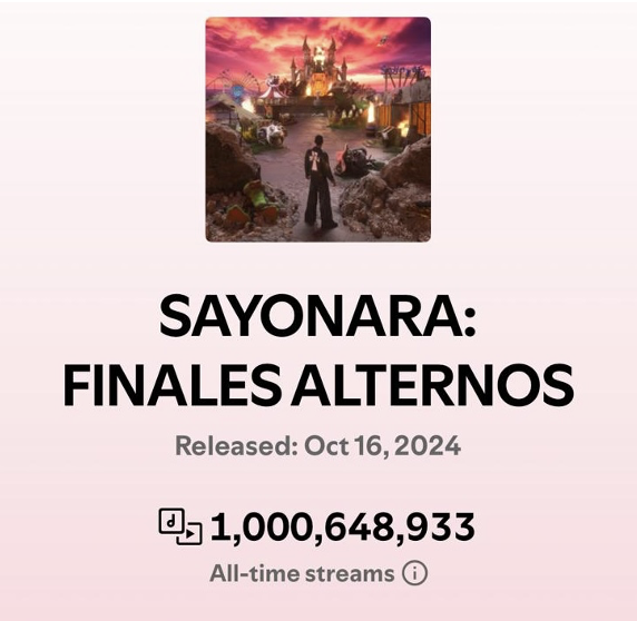 ‘SAYONARA: FINALES ALTERNOS’, EL CUAL INCLUYE EL TEMAZO “XQ ERES ASÍ” CON NATHY PELUSO QUE FUE NOMINADO AL LATIN GRAMMY 2025 COMO MEJOR CANCIÓN URBANA, SUPERÓ 1.3 BILLONES DE REPRODUCCIONES A NIVEL GLOBAL EL MES PASADO!
