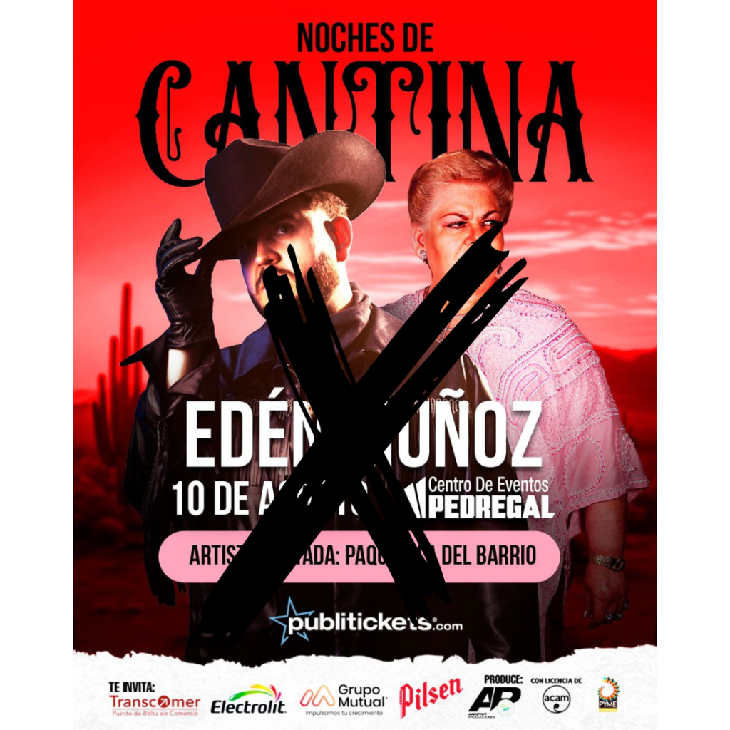 Por este medio, ARCEYUT PRODUCCIONES informa a todos los fieles seguidores de Edén Muñoz y “Paquita la del Barrio”, que el esperado evento “Noches de Cantina” previsto para este sábado 10 de agosto en Eventos Pedregal, será REPROGRAMADO a una nueva fecha que aún se encuentra en proceso de evaluación y logística hasta nuevo aviso.