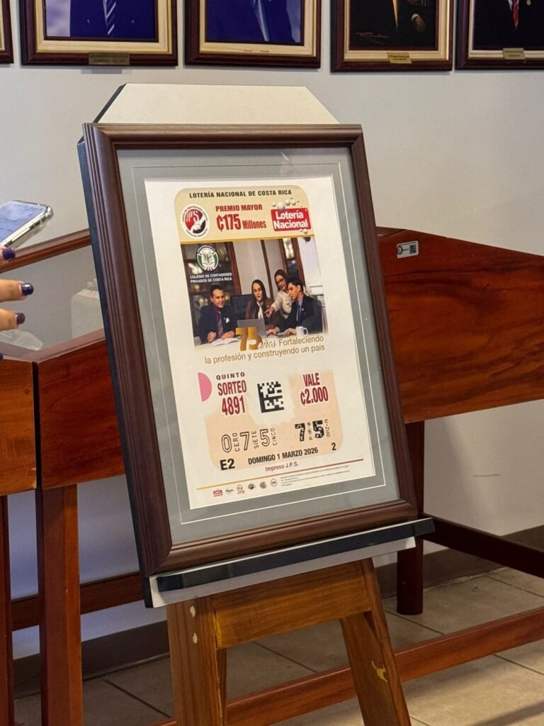 San José, Costa Rica. 24 de febrero de 2026. El Colegio de Contadores Privados de Costa Rica, en su 75 aniversario, recibió de parte de la Junta de Protección Social de San José el diseño del billete de lotería que reconoce su aporte en la regulación y actualización de la normativa contable en Costa Rica.
