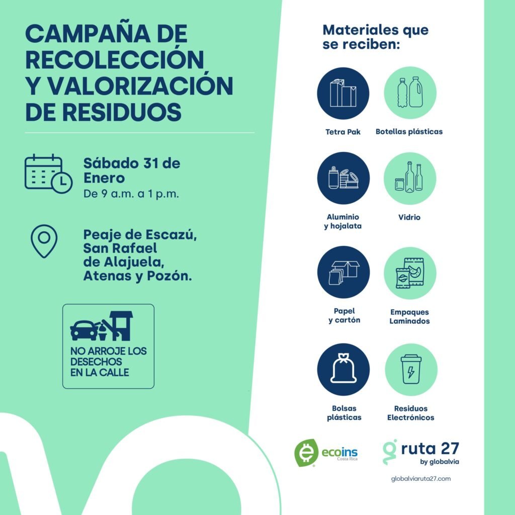 Como parte de su compromiso con la sostenibilidad, Ruta 27 by Globalvia, desarrollará una campaña de recolección y revalorización de residuos este sábado 31 de enero, de 9 am a 1 pm, en los parqueos de los edificios de peajes de Escazú, San Rafael de Alajuela, Atenas y Pozón.