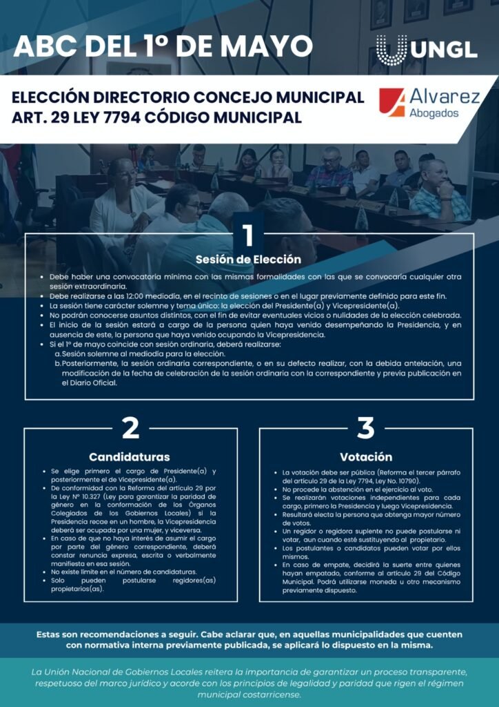 San José, Ayer 29 de abril 2026. La Unión Nacional de Gobiernos Locales (UNGL), entidad que agremia y representa políticamente al régimen municipal costarricense desde hace 48 años, informa que el próximo 1° de mayo de 2026 los Concejos Municipales de todo el país elegirán a sus Presidencias y Vicepresidencias mediante votación pública, procedimiento que se aplicará por primera vez tras la reforma al artículo 29 del Código Municipal aprobada a finales de 2025 (Ley N.° 10.790).