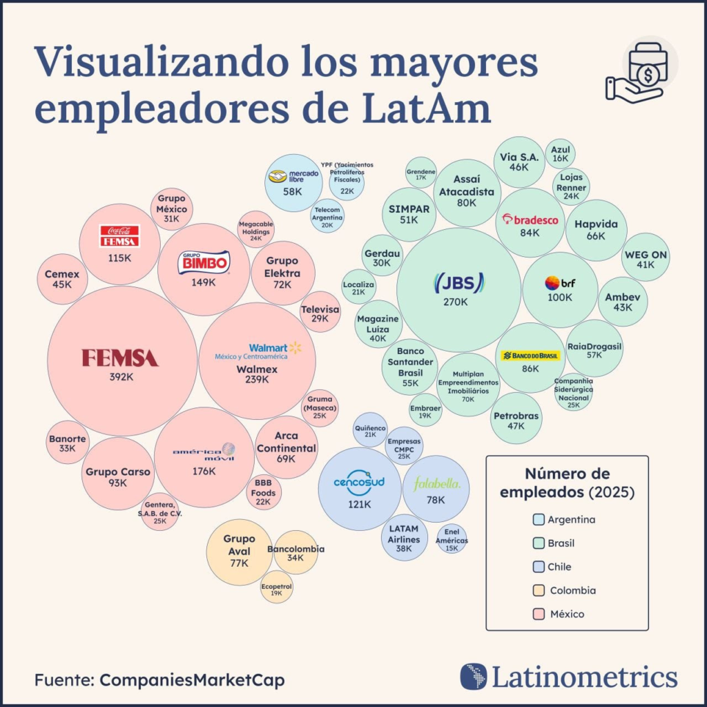 JBS también es la única empresa multinacional brasileña que tiene más de 100K empleados. En contraste, una empresa chilena y cinco mexicanas se encuentran dentro de este umbral; y ninguna empresa es un jugador más grande que FEMSA. Sigue leyendo desde Latinometrics.
