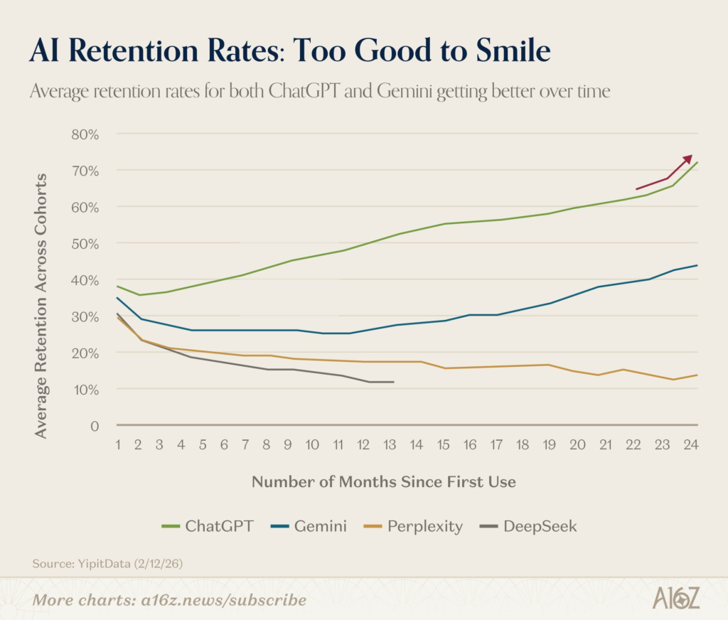 Las tasas de retención promedio de ChatGPT mejoran a partir de la semana 2 y, aún más impresionante, se doblan hacia arriba en la semana 23.