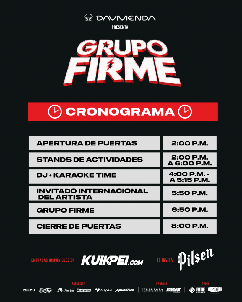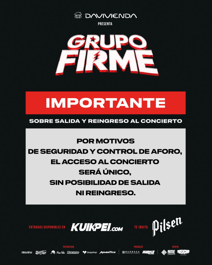 San José, Costa Rica. H Barboza Producciones, como productora nacional encargada del espectáculo de Grupo Firme en Costa Rica, y por Arceyut Producciones, como el promotor, desean informar los siguientes detalles a quienes van a asistir al concierto de Grupo Firme de este sábado 28 de marzo, en el Estadio Nacional: