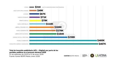 En paralelo, el informe advierte que la campaña electoral también se está librando como una gran disputa mediática, con una alta concentración de pauta. Según los datos de Kantar IBOPE Media citados en el reporte, entre el 1 de setiembre de 2025 y el 12 de enero de 2026 se han invertido $2.126.528,69 en publicidad política, y Claudia Dobles y Laura Fernández concentran 44% de la inversión, dominando la estructura de visibilidad pagada del proceso.