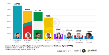 A nivel de visibilidad digital, el estudio confirma una concentración marcada en pocas candidaturas. Laura Fernández (PPSO) lidera el volumen de conversación del periodo con 113.722 menciones, seguida por Claudia Dobles (CAC) con 94.898, Álvaro Ramos (PLN) con 92.106 y Ariel Robles (FA) con 73.194 menciones.