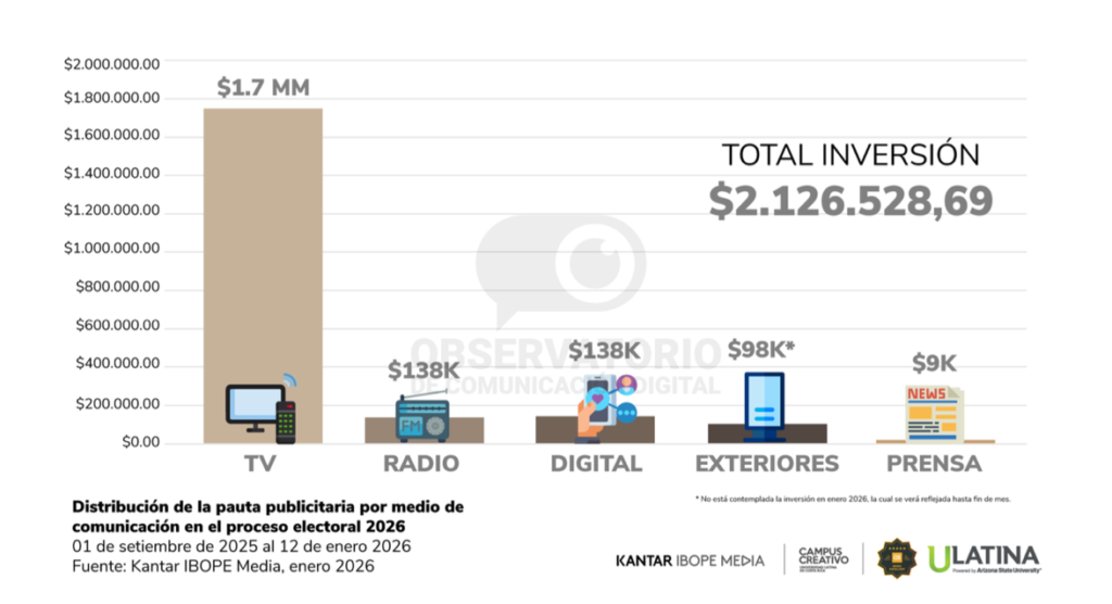 “Este hallazgo confirma que las campañas están enfrentando dos realidades: un ecosistema digital que define  narrativas, emociones y conflicto en tiempo real, y una estructura presupuestaria que sigue dependiendo de  la televisión como eje de alcance masivo y legitimidad”, agregó Bonilla.