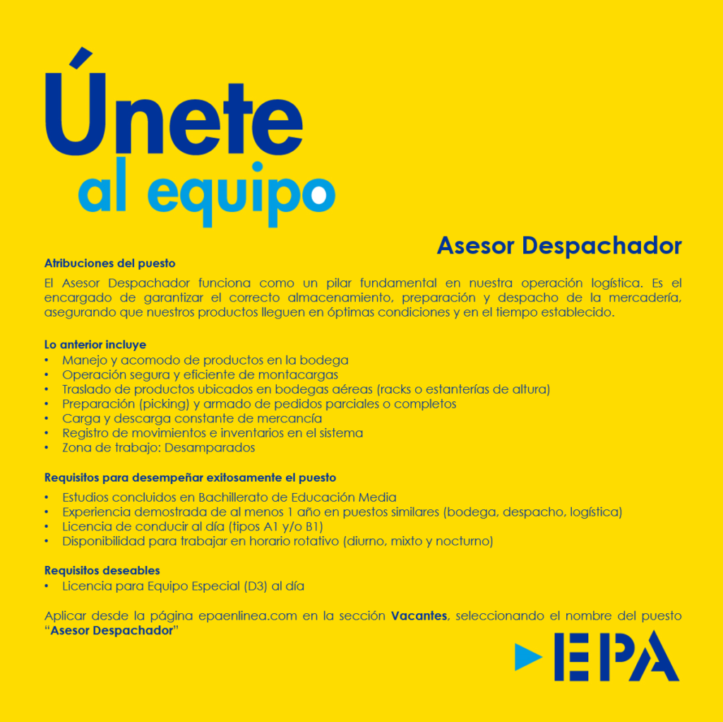 Durante la jornada, que se realizará de 10:30 a.m. a 5:30 p.m., EPA reclutará talento para fortalecer su operación logística en Desamparados. El puesto de Asesor Despachador cumple un rol clave en el manejo, preparación y despacho de mercancía, asegurando eficiencia y calidad en cada etapa del proceso.