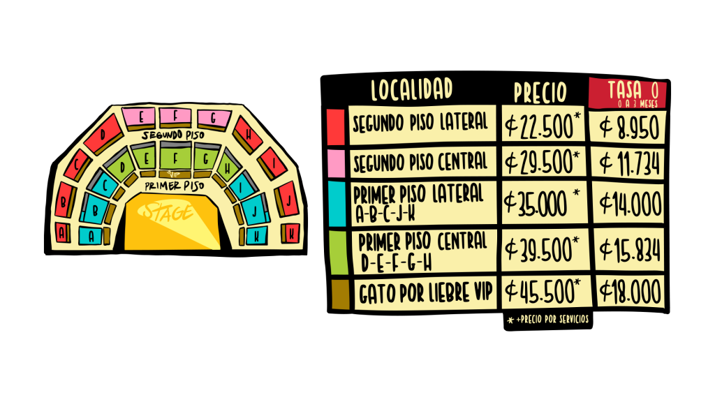 Las entradas estarán disponibles a través de www.eticket.com, con precios que van desde los C22.500 colones hasta los C45.500 colones, más costos por servicio. Se ofrecerá tasa 0 a 3 meses sin intereses para clientes BAC.