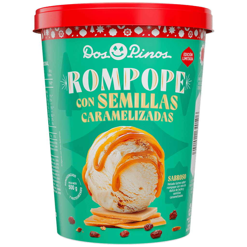 ● Cono Krunchy Rompope 75g: Un helado de temporada que une la suavidad del rompope con la textura crujiente del cono Krunchy. ● Helado Rompope Navidad 500g: Vuelve renovado con semillas caramelizadas, que le añaden un contraste dulce y crocante, ideal para las celebraciones.
