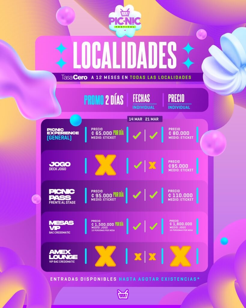 Algunas entradas por día y para ambos sábados continúan disponibles a través de eticket.cr, en localidades Picnic Experience (General) para ambos días, Jogo disponible únicamente para el sábado 14, y Picnic Pass y Mesas VIP BAC aún habilitadas en ambos fines de semana, además de contar con la opción de Tasa Cero de BAC hasta 12 meses, facilitando el acceso del público a esta nueva edición del festival.