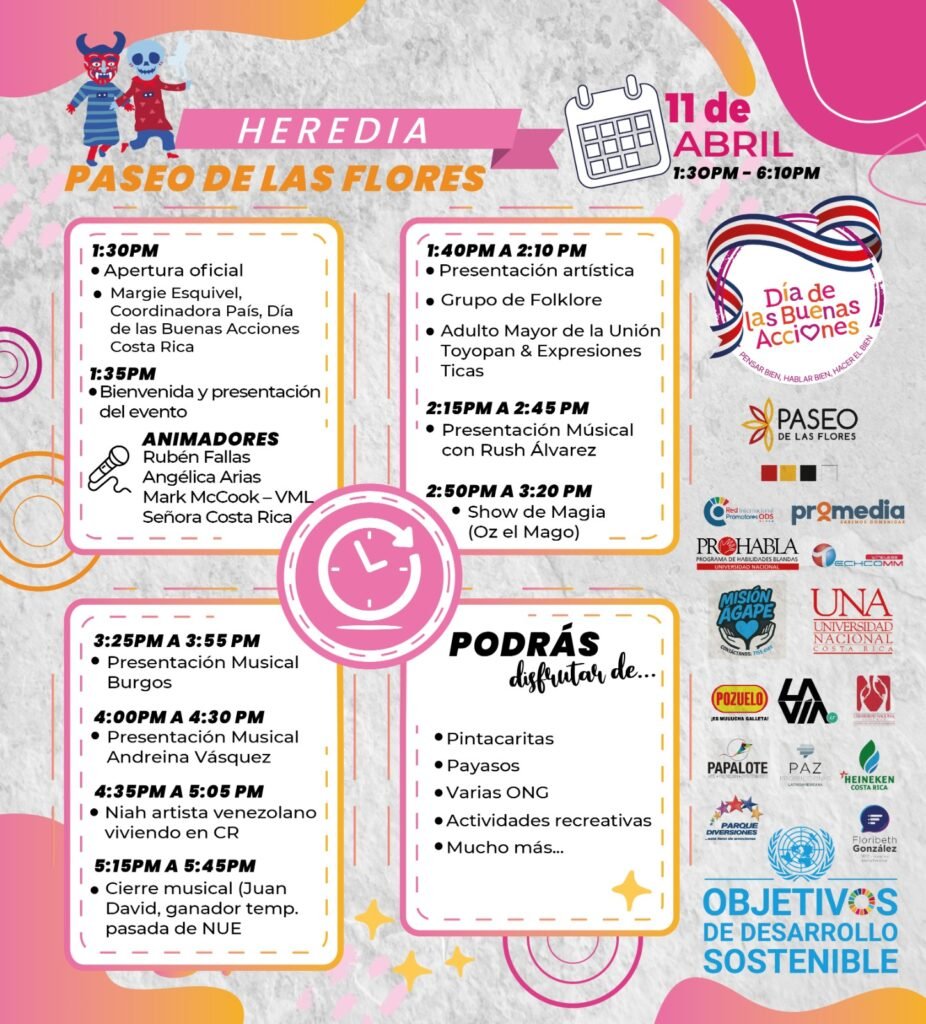 | Heredia | 11 al 18 de abril | Feria del Día de las Buenas Acciones en Paseo de las Flores (11 de abril) con la presentación en concierto de Rush Álvarez, Burgos, Andreina Vázsquez, Niah y Juan David, así como la presentación de Oz el Mago. Acompañamiento a adultos mayores y actividades recreativas para niñez en Sarapiquí. |