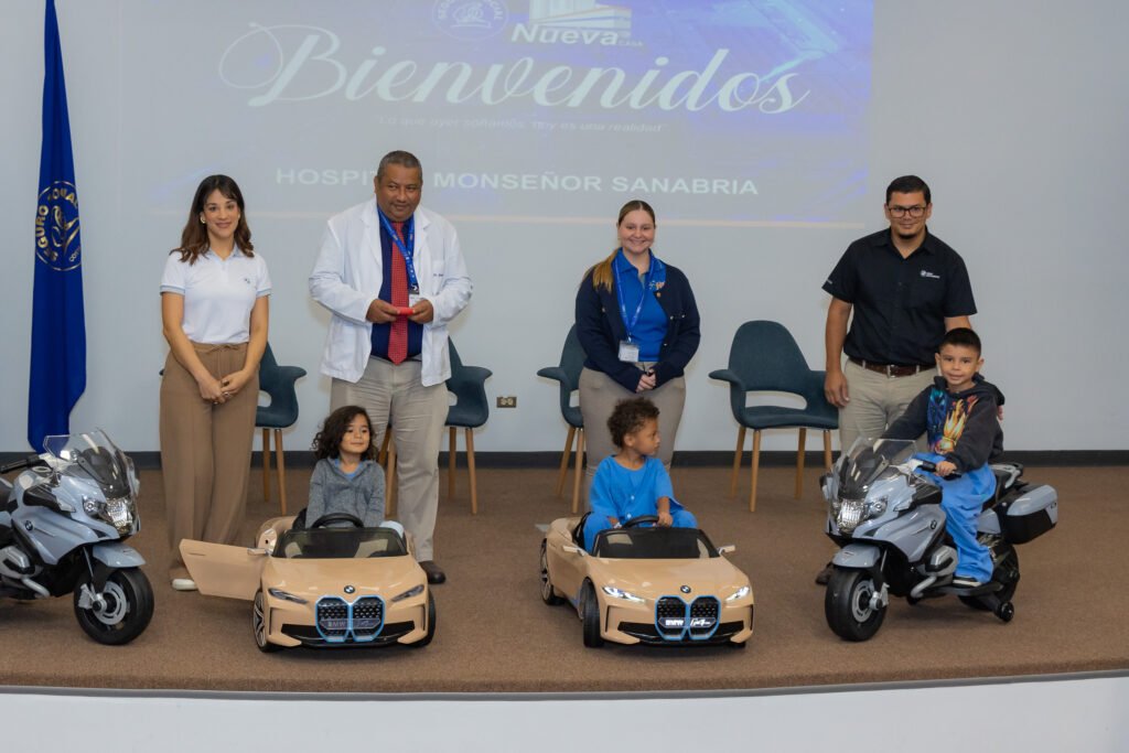 El servicio de Pediatría del Hospital Monseñor Sanabria, en Puntarenas, cuenta desde hoy con una herramienta lúdica y segura para trasladar a niñas y niños hacia cirugías y otros procedimientos: dos motocicletas BMW R 1200 RT y dos carros BMW i4 de juguete, montables y operadas por control remoto.