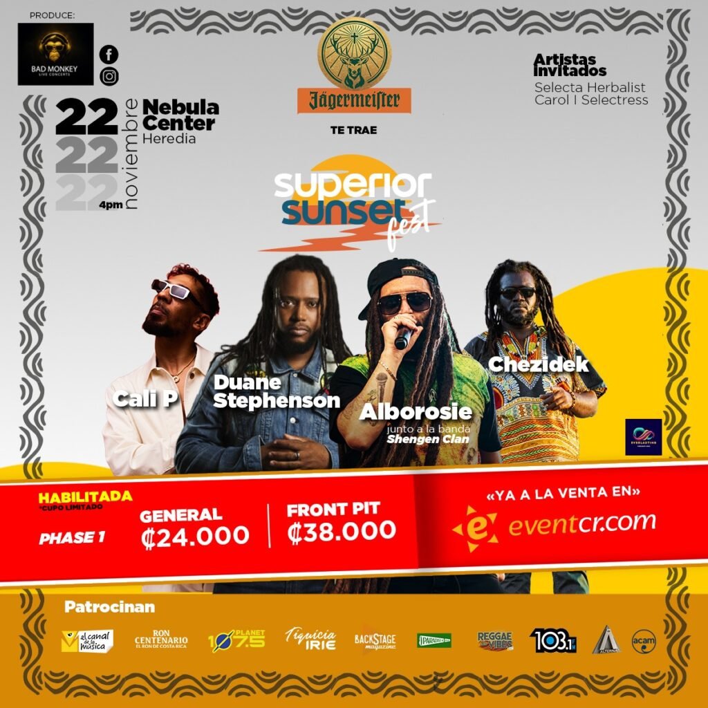 San José, Costa Rica) — La magia del reggae internacional se apoderará de Costa Rica el 22 de noviembre, cuando los reconocidos artistas ALBOROSIE • DUANE STEPHENSON • CHEZIDEK • CALI P, junto a la banda SHENGEN CLAN, llegan al país para ofrecer un espectáculo inolvidable en el Nebula Center de Heredia, como parte del esperado Superior Sunset Fest.